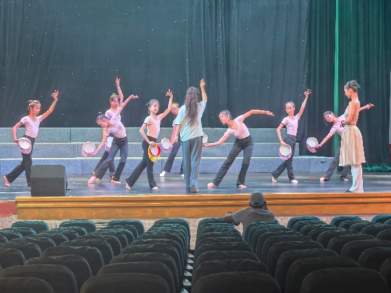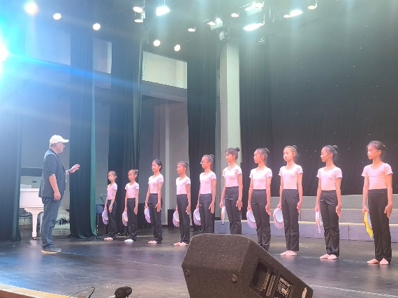 从整体到细节,大师风范润物无声 指导过程中,徐森忠老师结合自身艺术积累与舞台经验,对《春嬉》作品进行系统分析。他围绕作品立意、结构节奏、舞美灯光配合及情感表达层次提出具体建议,同时指出,优秀作品需兼具扎实技术与情感内核。 在舞台上,徐森忠老师现场调度队形,向孩子们讲解每个调度对应的情感逻辑。孩子们专注聆听,跟随指导调整动作,积极把握提升机会。  亲身示范,细化表演细节 与徐森忠的整体指导相配合,青年舞蹈演员徐菁菁从表演细节切入,将艺术要求转化为具体动作与表情示范。从眼神传递、手腕翻转到鼓点节奏把控,徐菁菁老师逐一讲解并示范,帮助孩子们理解角色,提升舞蹈表现力。两位指导者分别从作品整体与表演细节发力,让参与师生深受启发。