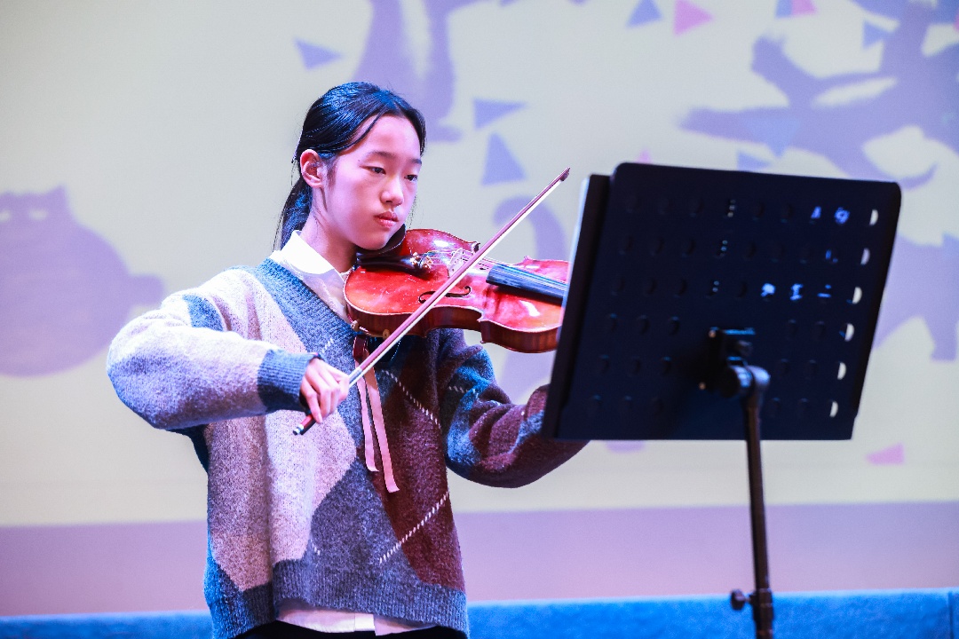 尤为值得一提的是,在小书友们分享之时,小提琴社团的应艺涵同学以悠扬的琴声现场伴奏。跳动的音符与稚嫩的声音交织相融,为整个分享环节铺就了一层温暖而高雅的艺术底色,让书香在旋律中流淌,也让本次书友会的体验更加丰富动人。