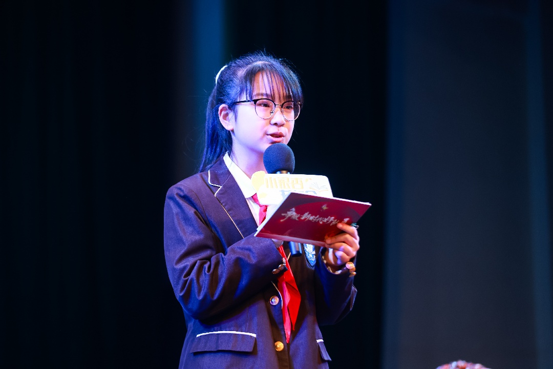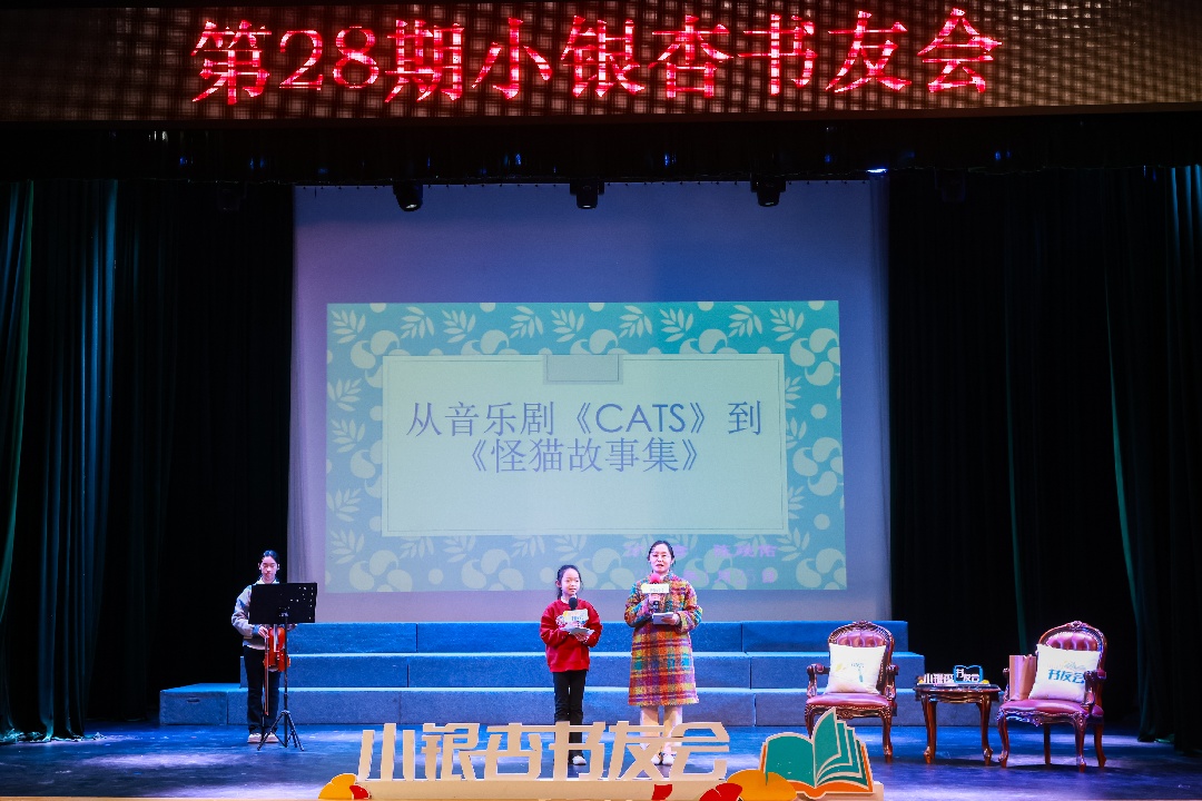 02 分享:经典书中寻智慧,童声话里见成长 “一卷经典,承载千年文脉;一次分享,传递无限书香。”在好书分享环节,三位小书友依次登台,用稚嫩却真诚的声音,带领大家走进书中的世界。 来自广育小学的陈琬佑和她的妈妈同台分享了《怪猫故事集》,她们生动解读了魔术猫的奇幻、铁路猫的坚毅与小偷猫的狡黠,陈琬佑更以音乐剧表演的形式,将书中角色活灵活现地呈现在舞台上,这种富有创意的阅读延伸形式,让经典故事焕发出新的生命力与趣味。