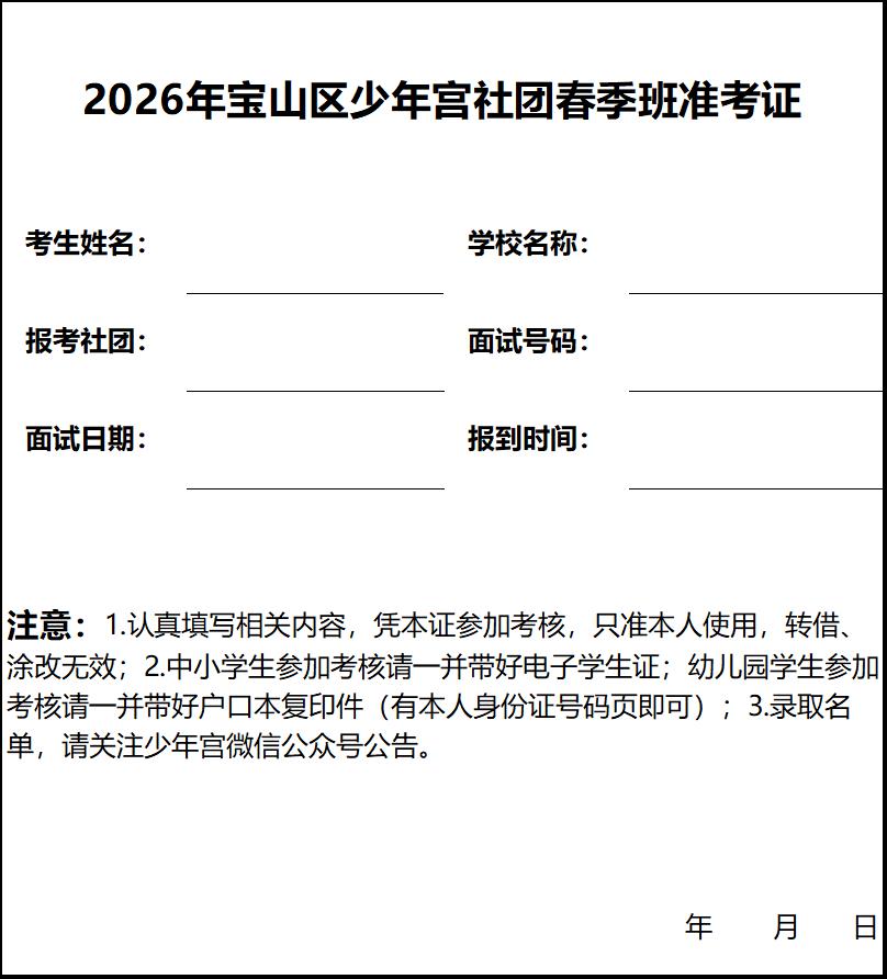 一、面试时间:2026年1月17日(周六7:45-16:00) 二、面试地点:宝山区少年宫(盘古路428号) 三、面试须知: 1.请自行下载并填写好准考证,面试编号等信息详见公示,当天凭准考证有序进场;